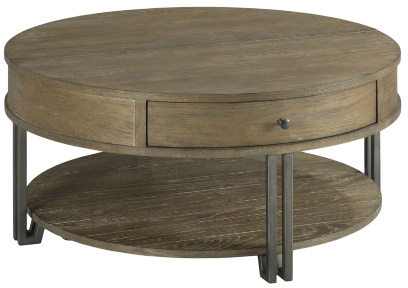 The Saddletree brown round cocktail table adds both function and charm to your living space. Crafted of rubberwood solids and oak veneers, it features a warm brown finish and a convenient lift-top design. Perfect for entertaining or everyday use, this table combines durability, style, and versatile storage solutions.Read More
