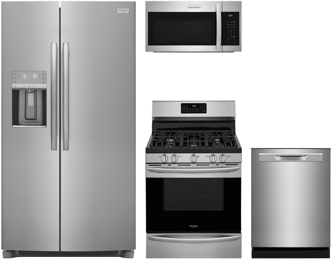 Frigidaire Gallery® 4 Piece Stainless Steel Kitchen Package with side by side refrigerator, free standing gas range, built in dishwasher and over the range microwaveRead More