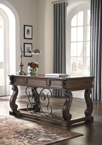 With the rich rustic brown finish flowing beautifully over the scrolling ornamental base along with the wrought and cast metallic looking accent in a burnished gun metal finish, the elegant Vintage Casual design of the “Alymere” home office collection takes rustic to the next level to enhance the atmosphere of your living space.