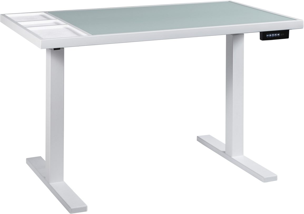 Elevate the art of simplicity with this ultra-contemporary adjustable height desk. Its crisp white powdercoat finish is paired with a frosted glass top with recessed tray for a rich blend of form and functionality. Desk’s electric lift design includes two programmable height settings for your convenience.Read More
