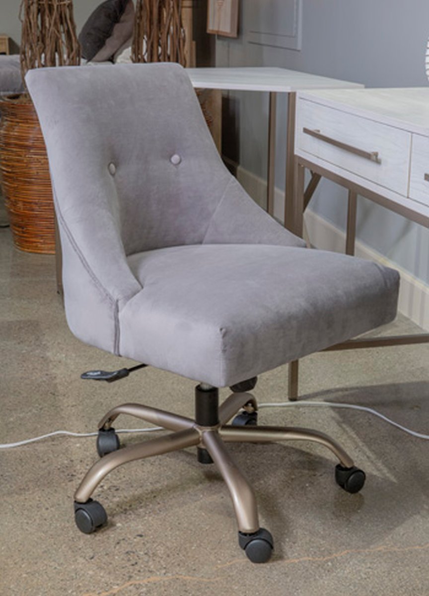 Signature Design by Ashley® Barchoni gray/gold home office desk chair features button detailing, curved backrest design and adjustable lift seat.Read More