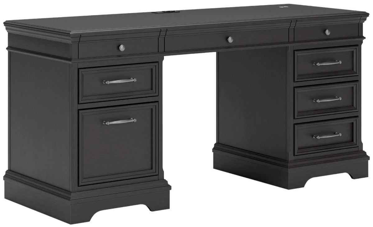 Make a style statement with this credenza and hutch. Its traditional design is updated with an on trend vintage black finish. The hutch with LED task light shines a light on those elusive reading glasses and other desktop items. The credenza's eight drawers, including a drop-front keyboard tray, add up to one well-organized workspace, while USB and wireless charging make staying productive that much easier.Read More