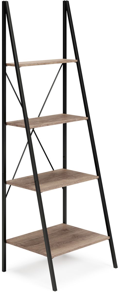 Crafted with a black metal frame with cross-braced styling and engineered wood shelves beautified with a grayish brown decorative wood grain laminate, this open-concept bookcase merges a cool look with a warm feel. Use as a single bookcase or combine two or more for a bunching wall.
