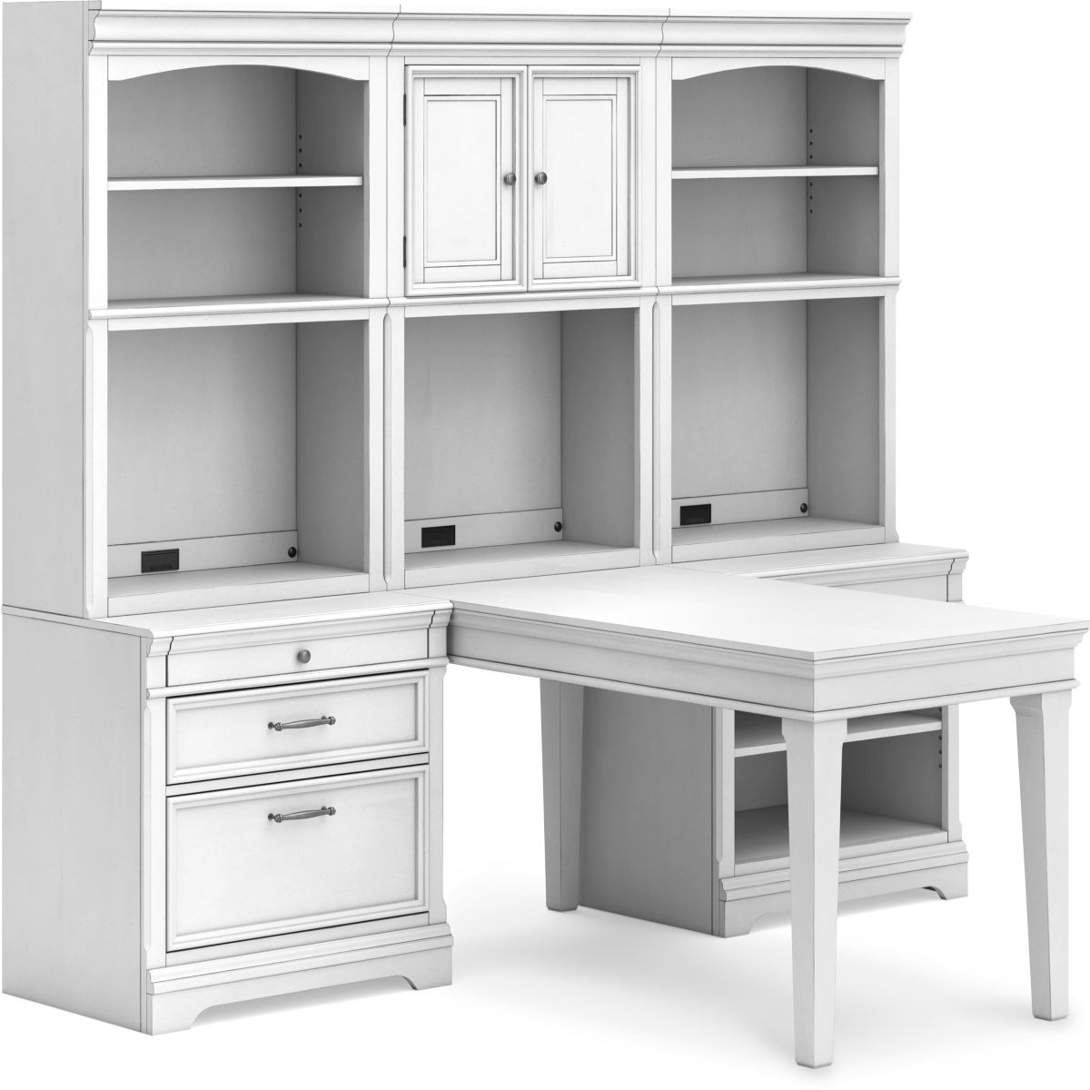Make a style statement with this home office collection. This set includes a 63" desk connected to a wall unit with plenty of storage and display space. Its traditional design is updated with an on trend distressed whitewash finish. The hutch with LED task light shines a light on those elusive reading glasses and other desktop items. Bookshelf, cupboard and cabinet space add up to a well-organized workspace, while USB and wireless charging make staying productive that much easier.Read More