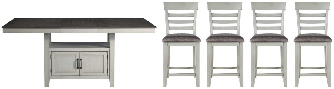 Relaxed, transitional styling in a neutral two-tone milk and honey finish are the hallmarks of the comfortable Hyland Counter Dining Set. A Storage Counter Table anchors any dining area ably with a 20-inch insertable leaf to expand to 80-inches for seating of up to eight.Read More