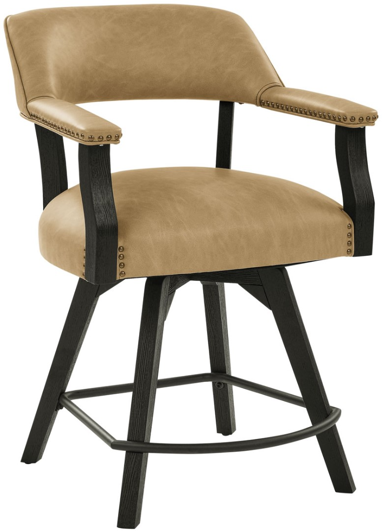 The Rylie 24-inch Counter Captain’s Chair, blending mid-century modern charm with modern functionality, features a 360-degree swivel for versatile movement. Its sleek black frame contrasts with sand-colored vegan leather upholstery, highlighted by nailhead trim.Read More