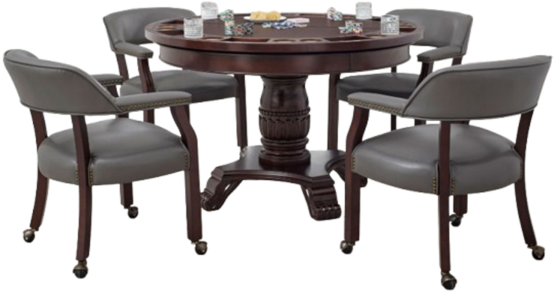 Enjoy both game night and dining night with this dual=purpose dining and game table. The 48-inch round table comes in a medium cherry finish and can accommodate four comfortably for dining with a game top that converts into a game table worthy of Las Vegas! The upholstered.captain’s chair is castered for easy mobility and comes in a wide range of colors perfect for every decor.Read More